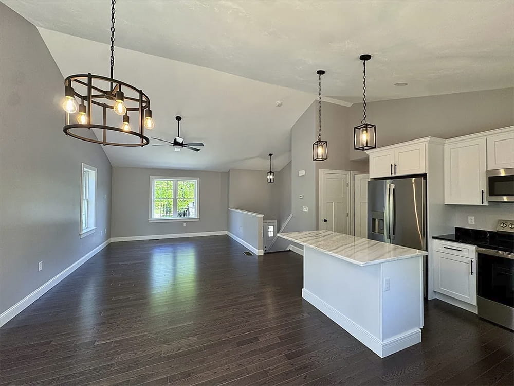 This beautiful NEW CONSTRUCTION raised ranch set on an R-80 lot in the charming town of Barre is a perfect opportunity to own a brand new home with flexible living space. The main level is approximately 1,400 sqft, and includes 3 bedrooms, 2 full baths, and open-concept living area. The bright and airy kitchen/dining space features a kitchen island, white shaker style cabinets, granite countertops, and dining area. The main level living room features hardwood flooring, ceiling fan, and vaulted ceiling. Maine level laundry. The lower level includes a bonus room, a fourth bedroom, and a third full bathroom. This energy efficient home will have an electric heat pump system and air conditioning. The 14′ x 14′ composite deck overlooks a beautiful, open backyard. There will be plenty of space for outdoor entertaining. Front entry two-car garage with oversized doors.
